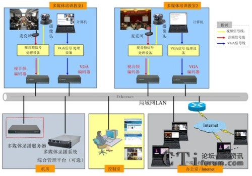 如上圖所示,銳取多媒體錄播成功實現(xiàn)了中國電力投資集團高級培訓中心兩間多媒體教室內培訓課程的錄制、直播和后期點播。銳取多媒體錄播前端的編碼器部署在多媒體教室,編碼器采集培訓的PPT和老師講課的圖像聲音編碼后通過網絡傳送給機房的多媒體錄播服務器,多媒體錄播服務器實現(xiàn)培訓過程中“教師學生圖像聲音+老師講稿(PPT)”的同步錄制、直播、點播。
