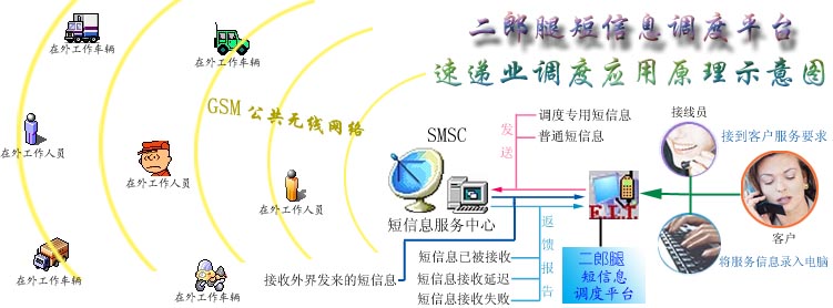二郎腿短信息調(diào)度平臺(tái)是利用目前社會(huì)上大眾普遍擁有手機(jī)的現(xiàn)成資源,通過移動(dòng)通訊公司提供的短信息服務(wù)功能作為通信信道,直接對手機(jī)進(jìn)行低層操作控制,以“收發(fā)短信息”的方式來實(shí)現(xiàn)信息的傳遞(通信資費(fèi)標(biāo)準(zhǔn)與在手機(jī)上收發(fā)短信相同)。調(diào)度平臺(tái)還對每條發(fā)出的信息的接收狀態(tài)進(jìn)行跟蹤,確保信息能被安全