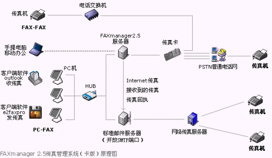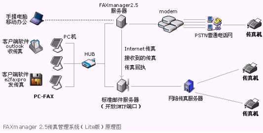 FAXmanager 2.5支持網(wǎng)絡(luò)傳真發(fā)送,具有內(nèi)嵌的網(wǎng)絡(luò)傳真服務(wù),價格比IP電話更加低廉。FAXmanager 2.5企業(yè)郵件管理系統(tǒng)有支持普通Modem的普通版本Lite版本,最多可以支持4只Modem,在局域網(wǎng)中的應(yīng)用請參見如下示意圖: