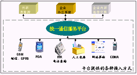 企業(yè)統(tǒng)一通信平臺(tái)提供了多種接入方式:人工坐席接入、自動(dòng)語(yǔ)音IVR、GPRS、WAP接入、寬帶接入、短信息接入;同時(shí)還提供了多種信息發(fā)布方式: