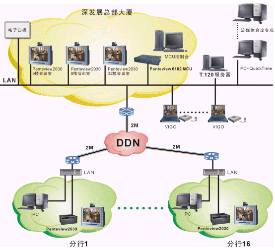 整個(gè)深圳發(fā)展銀行會(huì)議電視系統(tǒng)組網(wǎng)分為兩級(jí),中心點(diǎn)3套Penteview2030到下面的16個(gè)異地的分支行。深圳發(fā)展銀行大廈6樓大會(huì)議室、培訓(xùn)小會(huì)議室、32樓會(huì)議室作為主會(huì)議室,在6樓的機(jī)房中放置主MCU和一個(gè)終端,培訓(xùn)小會(huì)議室放置一個(gè)終端,其他16個(gè)異地分支行分別放置一臺(tái)Penteview2030終端,通過(guò)現(xiàn)有的深發(fā)展DDN網(wǎng)絡(luò)相互連通。根據(jù)深發(fā)展通信網(wǎng)絡(luò)結(jié)構(gòu)及傳輸容量的實(shí)際情況,會(huì)議電視系統(tǒng)采用星型拓?fù)溥B接,各地可通過(guò)現(xiàn)有的DDN專(zhuān)線(xiàn)劃出768K-2M的帶寬,進(jìn)行視頻會(huì)議的方式組建起多點(diǎn)會(huì)議電視系統(tǒng)。提供的方案為:MCU選擇支持H.323的MCU Penteview 6180,終端采用支持H.323的Penteview 2030;