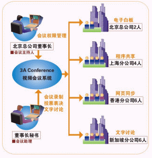 整個會議中,所有與會人員都可進(jìn)行文字討論;除 8位主管進(jìn)行視頻討論,其余12位主管均可看到討論的內(nèi)容和聽到談話,如果有哪位主管要發(fā)言或者加入視頻會議中,主持人可以選擇允許語音說話和允許視頻廣播,該主管就可參與發(fā)言。