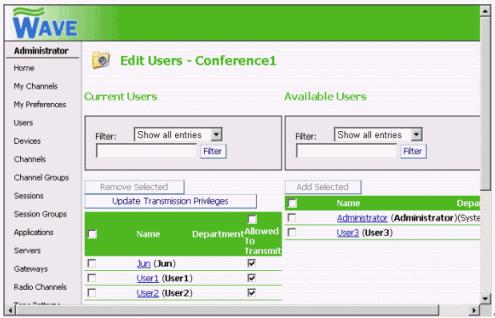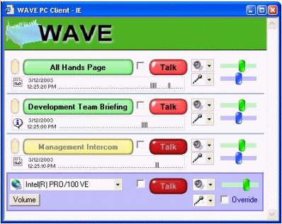 WAVE的使用方式為:管理員在服務器端建立IP電話會議,參加者使用本地計算機作為客戶端,通過耳機和麥克風即可加入會議。一臺普通的奔四PC機可以支持數千個會議,每個會議也允許數百個用戶參加。管理員可以分配用戶不同的權利:如講話,主持會議等等。