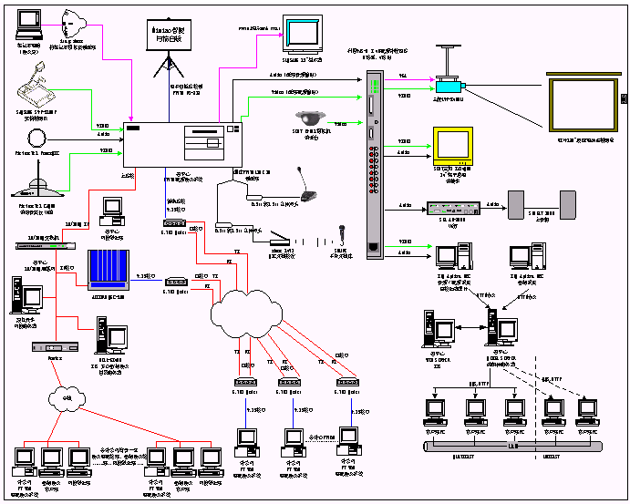 1、 電視會議系統(tǒng)包括一臺MCU和13臺iPower900,通過IP網(wǎng)絡(luò)和E1專線兩種線路連接。為了將視頻會議的功能進行擴展,我們增加了多種外圍設(shè)備,包括:實物投影儀、白板掃描儀、無線話筒、DV31攝像機等輸入設(shè)備,彩色電視機、三菱投影機和功放、音箱等輸出設(shè)備以及8×4視頻切換矩陣。