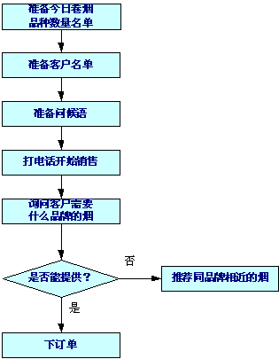 。。我們的訪銷流程是:準(zhǔn)備今日卷煙品種數(shù)量名單---準(zhǔn)備客戶名單---準(zhǔn)備問候語---打電話開始銷售---先問客戶需要什么煙---如能提供的就下訂單。如有不能提供的,向其推薦同品牌相近的煙 。 (請?jiān)斠娨韵铝鞒虉D)