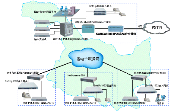 ×省×廳和與各地市局之間原來采用PSTN網(wǎng)絡實現(xiàn)語音通信,省局和市局,市局和市局之間每個月的通訊費用高達數(shù)萬元,無形之中長途電話費用已經(jīng)成為日常行政支出中很大的一部分。該廳已經(jīng)采用港灣公司NetHammer