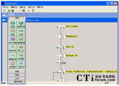 兩個集成環(huán)境,Easy Studio負(fù)責(zé)自動語音流程的編輯和調(diào)試,EasyAdmin負(fù)責(zé)對語音卡硬件的操作和按照EasyStudio生成的具體語音流程的實現(xiàn)。EasyCTI綜合實現(xiàn)了呼叫中心中IVR(Interactive