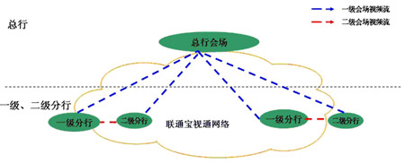 傳輸層:采用網(wǎng)通“寶視通”視頻會(huì)議運(yùn)營(yíng)網(wǎng),該網(wǎng)架構(gòu)在網(wǎng)通IP數(shù)據(jù)骨干網(wǎng)和本地傳輸與接入網(wǎng)之上的業(yè)務(wù)網(wǎng),采用H.264協(xié)議,面向民生行提供可管理的商用視頻會(huì)議網(wǎng)。