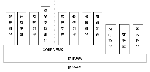 長話計費系統(tǒng)既包括計費結(jié)算系統(tǒng),又包括營業(yè)服務系統(tǒng),功能比較多,數(shù)據(jù)處理流程也相對復雜。 簡單的傳統(tǒng)數(shù)據(jù)庫的機械化編程已很難滿足系統(tǒng)對大數(shù)據(jù)量的處理及靈活性等方面的要求,因此在這套系統(tǒng)中,我們采用了一些當今業(yè)界的熱門技術(shù)。比如采用了CORBA軟總線思想和MQ Series消息管理隊列,也使之成為聯(lián)機計費系統(tǒng)平臺的一次成功實施。其系統(tǒng)層次結(jié)構(gòu)圖如下: