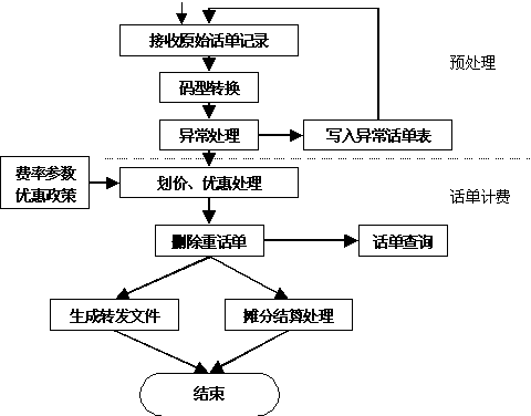 區(qū)域計費中心從交換機實時/定時采集原始話單數(shù)據(jù),它是整個系統(tǒng)的起始點,也是系統(tǒng)其它部分的基礎。其性能直接影響整個系統(tǒng)的運行效果。對該模塊要求穩(wěn)定可靠、處理靈活。 “八國九制”意味著,一個好的計費采集系統(tǒng),必然要求它能夠處理多種交換機格式。比如EWSD、S1240、5ESS等等。 在采集所用網(wǎng)絡傳輸協(xié)議上,一般要求系統(tǒng)支持X.25/FTAM、X.25/CMIP等協(xié)議。 2.計費結(jié)算 采集機從交換機上采集下來原始話單文件,該類文件是BCD碼文件,需要進行碼型轉(zhuǎn)換,變成ASCII碼文件,為后續(xù)的計費處理創(chuàng)造條件。 話單格式轉(zhuǎn)換:話單格式轉(zhuǎn)換從交換機下載的二進制信息中提取用于計費和統(tǒng)計的信息,并從二進制格式轉(zhuǎn)換為文本格式。但是由于上面提到的原因,國內(nèi)交換機種類比較多,各種交換機的數(shù)據(jù)格式都不相同,即使是相同的交換機,由于需要版本升級,也會對數(shù)據(jù)格式產(chǎn)生影響。假如預處理模塊不能靈活地處理各種格式的文件,則勢必會對電信服務商的投資造成浪費。國創(chuàng)公司在話單預處理中,提供了一種“自定義話單格式”方式,用戶可以根據(jù)自己交換機的數(shù)據(jù)格式進行配置,而預處理模塊不需進行修改。即可以適應當前多種交換機并存的局面,又可以適應未來交換機版本升級的需求,極大地保護了用戶的投資。 計費劃價處理: 計費計算模塊根據(jù)話單中記錄的起始時間、通話時長、對端號碼等信息在資費策略庫中查找滿足條件的費率極其優(yōu)惠策略。從而計算出此次通話應向用戶收取的基本費用。特別地,考慮到業(yè)務的發(fā)展與變化,系統(tǒng)可對費用中的各項子費用單獨計算,并能夠適應新的優(yōu)惠策略的增加。整個計費流程如下: