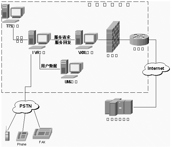 TTS系統(tǒng)、VXML系統(tǒng)、UMS系統(tǒng)與已有IVR(電話語音自動應答系統(tǒng))平臺、Internet、PSTN結合的示示意圖如下: