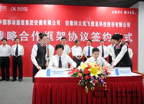 CTI論壇(ctiforum)7月14日消息(記者 張潔):7月11日下午,安徽科大訊飛信息科技股份有限公司與中國移動(dòng)通信集團(tuán)安徽有限公司在合肥簽署戰(zhàn)略合作框架協(xié)議。根據(jù)協(xié)議,科大訊飛和安徽移動(dòng)將在技術(shù)和業(yè)務(wù)創(chuàng)新等方面開展深層次合作。