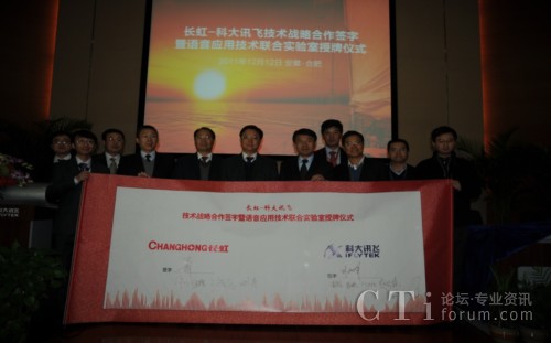 CTI論壇(ctiforum)12月14消息(記者 潘婷婷): 12月12日,科大訊飛與長虹集團戰(zhàn)略合作簽約暨共建聯(lián)合實驗室揭牌儀式在科大訊飛語音產(chǎn)業(yè)基地研發(fā)大樓隆重舉行。根據(jù)合作框架協(xié)議,雙方將在戰(zhàn)略聯(lián)盟的基礎上,以共建聯(lián)合實驗室為主要載體,旨在依托各自行業(yè)領域的長期積淀優(yōu)勢、強強聯(lián)合,達成戰(zhàn)略互信,加強緊密合作,積極推動“語音核心引擎+智能終端平臺” 的特色應用模式,深入拓展智能語音科技在智能電視等終端產(chǎn)品市場的應用范圍,合力開創(chuàng)智能語音終端創(chuàng)新應用市場空間。