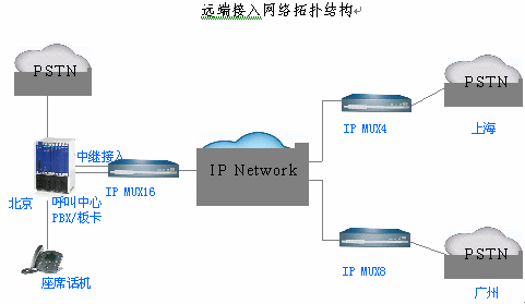 遠(yuǎn)端接入:根據(jù)實際遠(yuǎn)端中繼數(shù)量,選擇IP MUX4/8/16網(wǎng)關(guān),通過環(huán)路中繼接口連接本地的電信網(wǎng);