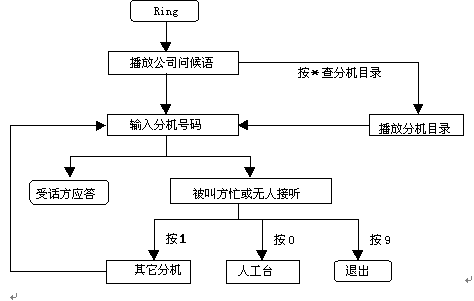 這種情況下自動(dòng)總機(jī)服務(wù)扮演了如同人工總機(jī)的角色,提示來話方鍵入分機(jī)號碼并將其轉(zhuǎn)接到指定的分機(jī)去。如果轉(zhuǎn)接不成功(被叫方占線,無人接聽等)系統(tǒng)提示主叫轉(zhuǎn)到其它分機(jī)或轉(zhuǎn)人工臺。