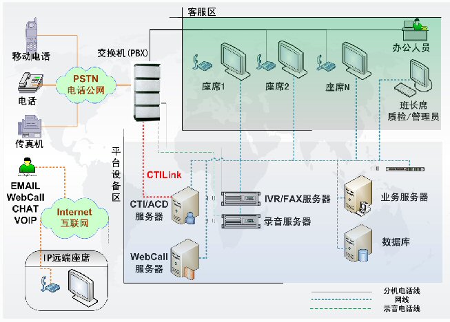 包含了PBX、CTI服務(wù)器、IVR/FAX服務(wù)器、錄音監(jiān)控 系統(tǒng)、報(bào)表統(tǒng)計(jì)系統(tǒng),CRM客戶管理等。