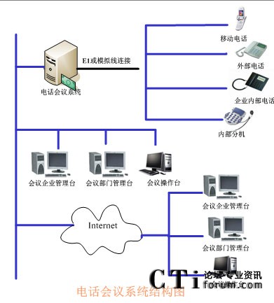 TalenTel CNF 電話會議系統(tǒng)需要與企業(yè)的PBX連接,如果沒有企業(yè)內(nèi)部程控交換機(jī)則可以將中繼線直接接在會議系統(tǒng)主機(jī)上,中繼線可以是普通模擬中繼,也可以是E1接口(如中國一號信令、30B+D等)。在與會議系統(tǒng)主機(jī)的同一網(wǎng)段上可以配置多個會議客戶端系統(tǒng),通過客戶端系統(tǒng)用戶可以隨時觀察和監(jiān)視會議系統(tǒng)的使用情況,并且可以建立常用用戶的用戶資料,也可以對常用用戶進(jìn)行分組,這樣要呼叫某些用戶開會時只需呼叫組用戶即可。