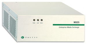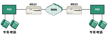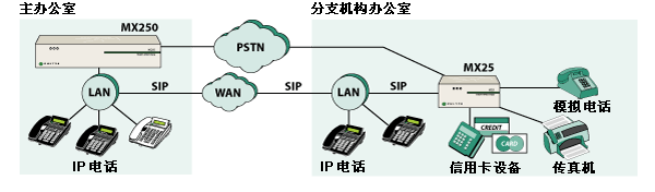 MX25 是一種能夠在兩種不同模式下工作的模塊化設備。在其中一種工作模式下,MX25 是一個通向 PSTN 網(wǎng)關的獨立 SIP。當在這種模式下工作時,MX25 轉換電話呼叫的格式,使其可以在 IP 網(wǎng)絡與公用電話網(wǎng)絡之間傳遞。另一種工作模式是,將 MX25 作為 MX250 的功能延伸系統(tǒng),用于不超過 25 個用戶的分支辦公室。在這種配置下,MX25 與 MX250 通信并交換有關用戶和設備的信息。即使連接 MX250 和 MX25 的 WAN 鏈路出現(xiàn)故障,MX25 也能繼續(xù)工作并處理來自/發(fā)往 PSTN 的傳入/傳出呼叫。