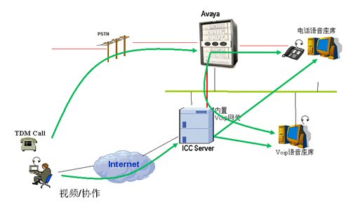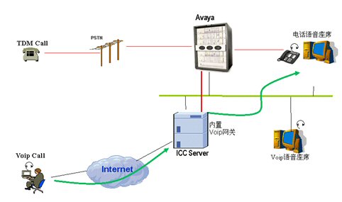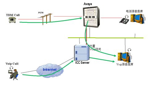 通過Internet來(lái)的Voip呼叫通過ICC服務(wù)器轉(zhuǎn)接到座席。