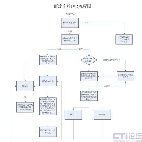 麗途商旅呼叫中心整個呼叫流程是:客戶通過全國400電話呼入系統(tǒng),IVR自動應(yīng)答,根據(jù)客戶來電號碼通過URL的方式和業(yè)務(wù)系統(tǒng)數(shù)據(jù)庫進(jìn)行查詢該來電號碼是否是老客戶,然后直接播報(bào)客戶對應(yīng)的企業(yè)名稱和麗途的歡迎語,客戶可以進(jìn)行訂單的審批和密碼驗(yàn)證或者轉(zhuǎn)人工服務(wù);如果是來電號碼在數(shù)據(jù)庫中不存在,IVR系統(tǒng)提示客戶輸入企業(yè)編號或者轉(zhuǎn)接人工服務(wù),輸入企業(yè)編號還會在數(shù)據(jù)庫中查詢是否是已存在客戶并執(zhí)行相應(yīng)的流程,如是新客戶那么就會轉(zhuǎn)接人工服務(wù),由人工來進(jìn)行訂單的制定、審批,密碼驗(yàn)證等工作。