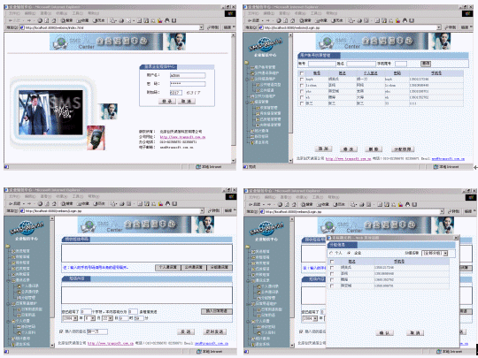 企業(yè)里的每個用戶要實現(xiàn)短信發(fā)送,僅需一臺電腦,然后利用瀏覽器就可以實現(xiàn)分組發(fā)送(如:會議通知、緊急通知)、定時群發(fā)(如:提醒短信、恭賀短信、祝福短信)、以及接收工作情況匯報短信等,系統(tǒng)提供通訊薄管理,可編輯常用短語。服務器端支持多個GSM設備群發(fā),滿足不同發(fā)送短信量的需要。快些下載系統(tǒng)的動畫演示,新增功能多多。!