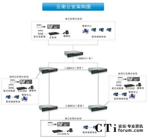 云南省公安廳視頻系統(tǒng)全網(wǎng)建設(shè)結(jié)構(gòu)分為三級(jí):共有146臺(tái)MCU,使用的是省廳—地州、市—縣級(jí)的3級(jí)樹狀級(jí)聯(lián)模式組網(wǎng)。整個(gè)項(xiàng)目遍布整個(gè)云南省公安系統(tǒng),項(xiàng)目實(shí)施至16個(gè)地州市、129個(gè)縣以及各縣轄區(qū)所有的派出所、戒毒所、看守所。會(huì)場(chǎng)數(shù)目前約有2200個(gè),還在陸續(xù)增加中。同時(shí)支持調(diào)用縣級(jí)公安局指揮中心監(jiān)控視頻編碼器的實(shí)時(shí)監(jiān)控圖像。