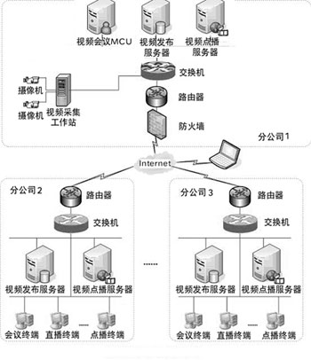 旺城國(guó)際控股集團(tuán)視頻會(huì)議系統(tǒng),其Internet出口帶寬為10M,因?yàn)樵摮隹谶要傳輸各種業(yè)務(wù)數(shù)據(jù),所以實(shí)際用于視頻會(huì)議的帶寬大概在5M左右,各分公司的接入速率在384Kbps~768Kbps之間。方案采用一臺(tái)高性能服務(wù)器作為MCU,以確保支持五會(huì)場(chǎng)的遠(yuǎn)程接入。同時(shí),在五個(gè)分公司配置一臺(tái)直播服務(wù)器,支持各地Intranet(均為100M帶寬)內(nèi)的電腦用戶(hù)接收會(huì)議現(xiàn)場(chǎng)組播,并錄制、上傳到點(diǎn)播服務(wù)器備份以供會(huì)后研討。整個(gè)視頻會(huì)議的包括: