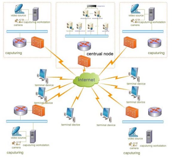 所有的部門的直播系統(tǒng)主要是進(jìn)行部隊(duì)演習(xí)、會議等現(xiàn)場的直播,直播信號通過WebLIVE視頻直播采集系統(tǒng)編碼壓縮,通過局域網(wǎng)上傳到中心機(jī)房,實(shí)時發(fā)布。采集同時,將直播的數(shù)字信號存儲為AVI文件,上傳到放置在視頻點(diǎn)播服務(wù)器內(nèi),供其它地區(qū)的部隊(duì)指戰(zhàn)員進(jìn)行點(diǎn)播。