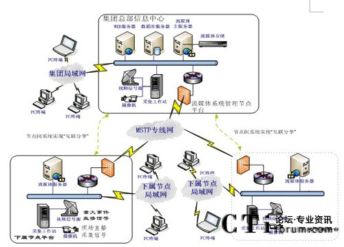 2、集團與各下屬節(jié)點之間采用MSTP專線連接,可實現(xiàn)集團總部視頻資源、網(wǎng)絡電視直播資源分發(fā)至各分節(jié)點;最終實現(xiàn)集團總部和各下屬單位可以互聯(lián)分享各種實況直播、培訓視頻資源等。