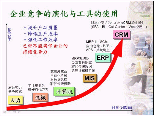 過去企業(yè)為取得同業(yè)間之競爭優(yōu)勢,無不絞盡腦汁針對『產(chǎn)品質量』、『生產(chǎn)成本』及『工作效率』等作為主要改善目標,除了從本身管理制度的檢討改進外,同時也積極運用現(xiàn)代信息科技的力量,規(guī)劃出適合自己的企業(yè)e化版圖,以因應全球化競爭時代的來臨,在此同時許多信息系統(tǒng)也逐步推動導入企業(yè)內部,包括:早期的MIS系統(tǒng)、近期的ERP系統(tǒng)、甚或電子簽核系統(tǒng)等,主要目的為提升內部工作效率、節(jié)省內部生產(chǎn)成本等作準備,以『節(jié)流』為目標強化企業(yè)自身的競爭能力。