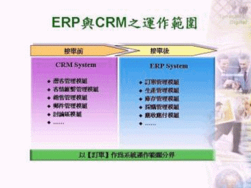 由上述可知,ERP系統(tǒng)主要應用于業(yè)務人員接到訂單后,便開始進入ERP系統(tǒng)的運作范圍內,一直到產(chǎn)品出貨收到貨款為止,故接單前的業(yè)務開發(fā)、客情維系甚或報價管理等工作,其實并非其主要應用范圍。