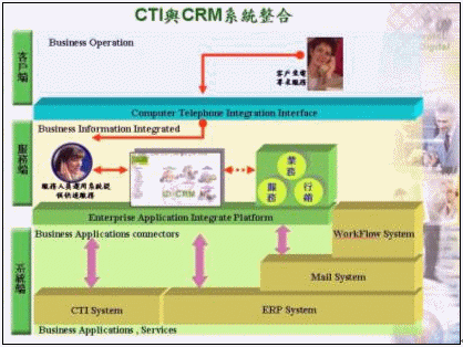 但傳統(tǒng)的CTI系統(tǒng)其重點乃是著重在服務工作的自動化方面,只提供簡單的客戶來電訊息提示,對于客戶進一步的背景資料、嗜好、購買需求及歷史往來記錄并不清楚也無法實時得知,更別說想藉由CTI系統(tǒng)來提供客戶個人化的服務、有效節(jié)省通話時間、刺激其潛在的購買需求,為了達成上述的目標,唯有將CTI系統(tǒng)與CRM系統(tǒng)進行整合,如此,客戶服務的質量才可能達成某個程度的提升,而良好的客戶關系管理也將是未來呼叫中心運作成功與否的關鍵所在。