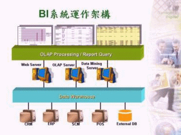 BI(Business Intelligence)即商業(yè)智慧,它是將企業(yè)內部各系統(tǒng)(如:CRM、ERP、SCM、POS等)之異質數(shù)據(jù)庫作一匯整,然后再加以整理、分析成有用的信息,以提供決策者作為企業(yè)經(jīng)營管理之參考。