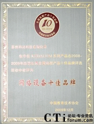 CTI論壇(ctiforum)12月14日消息(記者 張塵):2009年12月4日,由國(guó)內(nèi)教育權(quán)威機(jī)構(gòu)“中國(guó)教育技術(shù)協(xié)會(huì)”主辦,以讀者調(diào)查問(wèn)卷的形式舉行的第五屆全國(guó)電教產(chǎn)品十佳品牌頒獎(jiǎng)典禮在福州梅峰賓館盛大開(kāi)幕,科達(dá)教育視頻會(huì)議產(chǎn)品憑借卓越的產(chǎn)品性能和良好的客戶服務(wù)入選網(wǎng)絡(luò)產(chǎn)品類(lèi)十佳之列,同時(shí)也成為首個(gè)入選十佳品牌的視頻會(huì)議產(chǎn)品。