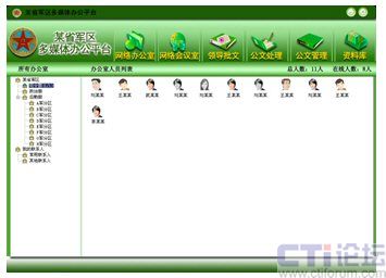 如圖所示的畫面即為網(wǎng)動協(xié)同辦公系統(tǒng)的基礎(chǔ)工具——協(xié)同通訊系統(tǒng),該系統(tǒng)可將部隊機構(gòu)內(nèi)的所有部門、人員按照實際的組織結(jié)構(gòu)列出,應(yīng)用該系統(tǒng)的人員通過點擊其他在線人員,從而有選擇性的與對方進(jìn)行語音、視頻、數(shù)據(jù)共享、點對點會議等各種操作,將以往“看不見”的對話變?yōu)椤懊鎸γ妗钡慕涣。相比于傳統(tǒng)的電話溝通而言,它不僅更暢通快捷,更可以最大化的降低溝通成本。另外,數(shù)據(jù)共享功能還可以將軍隊里需共同探討的話題,如作戰(zhàn)地圖動態(tài)研究、工作報告資料等實時顯示在數(shù)據(jù)區(qū)中,雙方通過電腦即可進(jìn)行遠(yuǎn)程的話題討論、圈點批注。