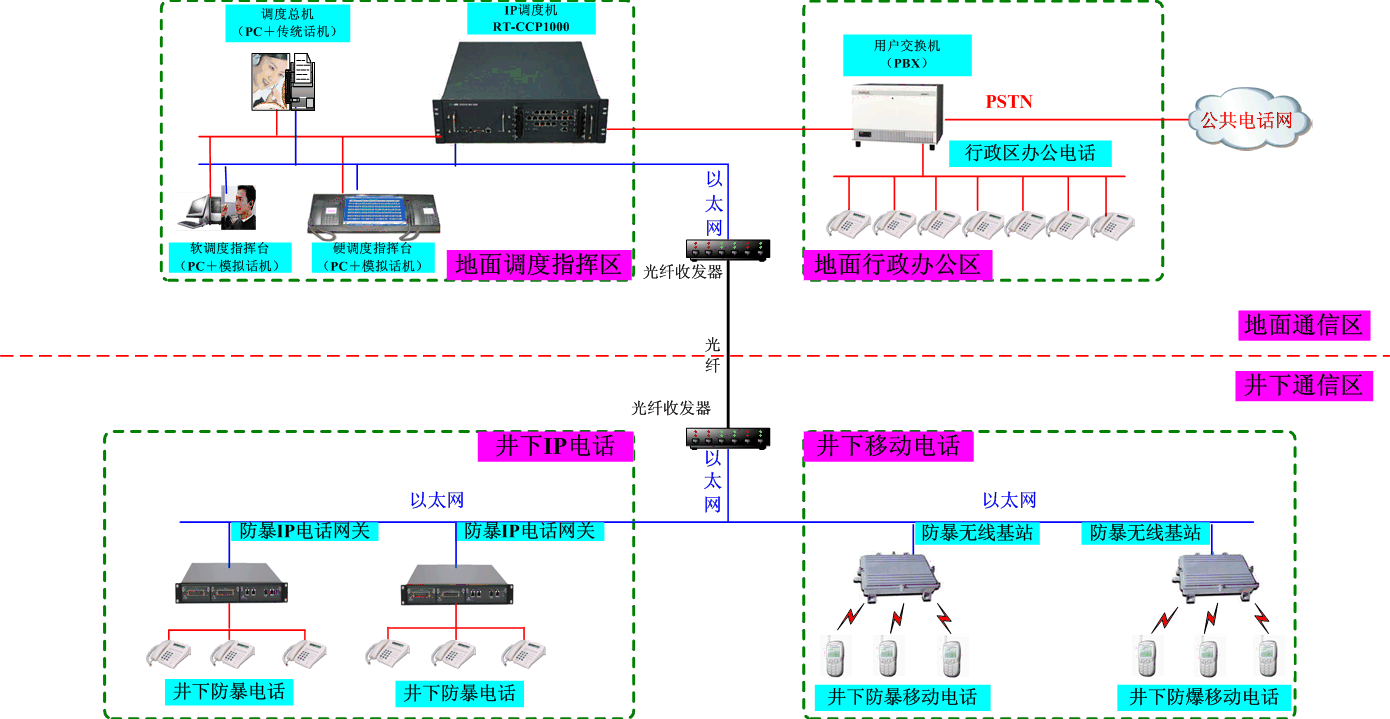 在傳統(tǒng)調(diào)度技術(shù)基礎(chǔ)上完美的將固話網(wǎng)絡、IP網(wǎng)絡、無線網(wǎng)絡充分融合,可以實現(xiàn)井上調(diào)度指揮區(qū)及井上行政辦公區(qū)、井下IP電話及井下移動電話的互通,也能提供接口與原有的行政辦公電話無縫整合。同時也完美的解決了不同網(wǎng)絡之間、多套系統(tǒng)之間存在兼容性差、共享性差、重復投資、操作復雜等諸多缺陷。