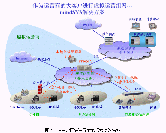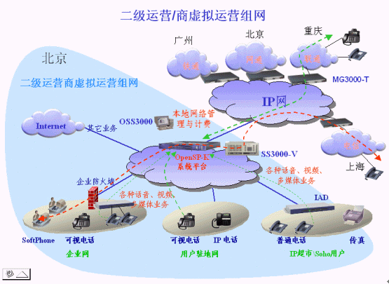 對于希望投資低啟動(dòng)快的虛擬運(yùn)營商,我們設(shè)計(jì)了mindSYS解決方案。在mindSYS解決方案中,以SS3000-V作為核心的呼叫控制、業(yè)務(wù)管理和計(jì)費(fèi)平臺(tái),配合中繼網(wǎng)關(guān)MG3000-T以及眾多的接入終端,組成一個(gè)完整的解決方案。該方案可以滿足虛擬運(yùn)營商的初期業(yè)務(wù)發(fā)展,有強(qiáng)大的組網(wǎng)適應(yīng)性和良好的管理計(jì)費(fèi)功能,并具備極好的可擴(kuò)展性,可以根據(jù)用戶的業(yè)務(wù)發(fā)展,平滑升級到更強(qiáng)大的增值業(yè)務(wù)、運(yùn)營管理計(jì)費(fèi)平臺(tái)--OpenSP-K平臺(tái),無縫過渡到完善的大規(guī)模虛擬運(yùn)營解決方案。