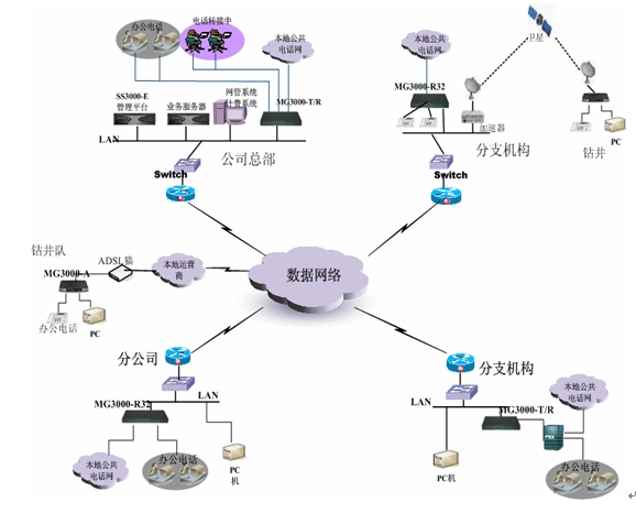 對(duì)規(guī)模比較小的辦事處,或者遠(yuǎn)端的鉆井隊(duì),一般在本地都是采用ADSL接入這樣方式,這樣情況可以直接配置MG3000-A語(yǔ)音往關(guān),實(shí)現(xiàn)語(yǔ)音數(shù)據(jù)同傳方式。MG3000-A提供1、4、8口多種方式供實(shí)際情況來(lái)選擇。所有的號(hào)碼可以直接在總部中心的平臺(tái)來(lái)分配控制。