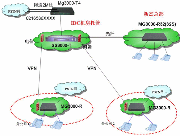 各地全部采用MG3000-R,通過VPN注冊到軟交換平臺上,S口接普通電話,O口接原來的模擬線,整個系統(tǒng)通過各地-R的O口實現(xiàn)長途落地的功能。