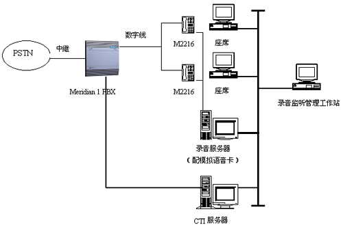 使用Meridian 2216 ACD數(shù)字話機(jī)上的錄音端口,直接接入模擬語音卡,進(jìn)行錄音監(jiān)控。其物理結(jié)構(gòu)如下所示: