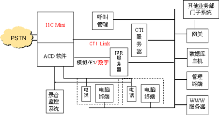通過CTI Link M1D軟件,實現(xiàn)CTI服務(wù)器與11C Mini交換機(jī)之間進(jìn)行呼叫狀態(tài)傳遞和呼叫控制,支持北電ACD、CDN等先進(jìn)排隊技術(shù)。同時還為客戶端提供CTC