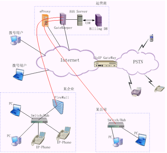 運(yùn)營級IP電話解決方案為運(yùn)營商提供一種可靠經(jīng)濟(jì)的VoIP接入平臺與VoIP骨干網(wǎng)互連,這種方式可以充分利用網(wǎng)絡(luò)資源,降低用戶服務(wù)價格,提高運(yùn)營商的競爭力。它為用戶提供了多種業(yè)務(wù)類型,除了可以實(shí)現(xiàn)任意兩點(diǎn)間的PC互通外,還可以實(shí)現(xiàn)PC通過VoIP網(wǎng)關(guān)與PSTN用戶間的互聯(lián)互通。