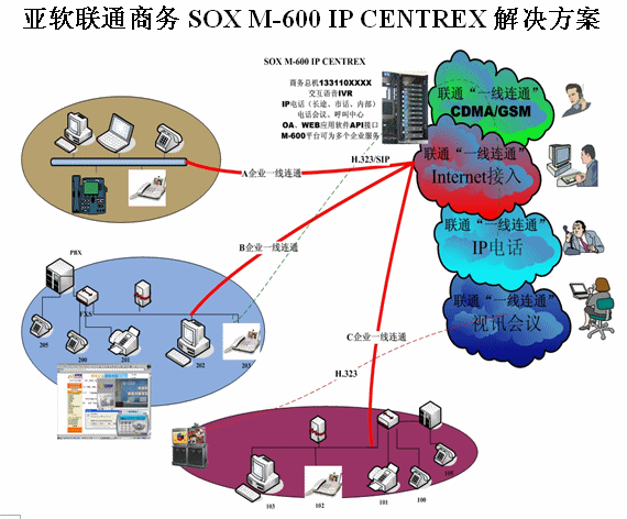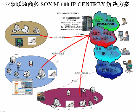 亞軟SOX融合通信解決方案也叫聯(lián)通商務(wù)解決方案,該方案是基于軟交換的可為多個(gè)集團(tuán)用戶提供IP語(yǔ)音解決方案。SOX融合通信解決方案為集群用戶提供了區(qū)別于傳統(tǒng)集團(tuán)內(nèi)部、外部的通信方式,集團(tuán)無(wú)需再購(gòu)置PBX及為其支付維護(hù)費(fèi)用。由于SOX融合通信解決方案是置于IDC托管中心并基于IP軟交換技術(shù),所以沒有地域限制,具有集群性、可移動(dòng)性等IP通信特征。