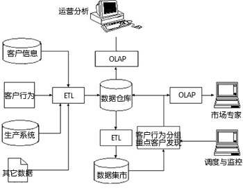 數(shù)據(jù)主要有四個(gè)方面的來源:客戶信息、客戶行為、生產(chǎn)系統(tǒng)和其它相關(guān)數(shù)據(jù)。這些數(shù)據(jù)通過抽取、轉(zhuǎn)換和裝載過程,形成數(shù)據(jù)倉庫,并通過OLAP和報(bào)表,將客戶的整體行為分析和企業(yè)運(yùn)營分析等傳遞給數(shù)據(jù)倉庫用戶。
