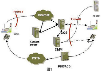 ----圖2說(shuō)明了在集成互聯(lián)網(wǎng)電話網(wǎng)關(guān)時(shí)進(jìn)行協(xié)同會(huì)話的流程,圖中實(shí)線為數(shù)據(jù)信息傳遞的鏈路,虛線為語(yǔ)音傳遞的鏈路。通過(guò)ITG和PBX/ACD 的特定交互接口,將呼叫中心外部的IP電話鏈路集成到CCIS系統(tǒng)中。值得注意的是,ITG 和CCS需要安裝在企業(yè)防火墻的外側(cè),以方便呼叫者的訪問。
