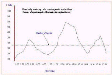 Inbound的來(lái)話量成不規(guī)則的波形圖,形成這種不規(guī)則波形圖中波峰和波谷的原因是在這些波峰和波谷工作的員工數(shù)量。(見(jiàn)圖8.來(lái)話量的分布圖)這將對(duì)在一天中的每個(gè)時(shí)段能夠分配最理想的員工來(lái)工作造成了最大的困難。一個(gè)小時(shí)能可能從來(lái)話量的波峰到達(dá)波谷,管理人員如何排班來(lái)匹配話務(wù)量對(duì)人員的要求,這是很多人的困惑。下圖描繪了某個(gè)呼叫中心8小時(shí)來(lái)話量分布情況。