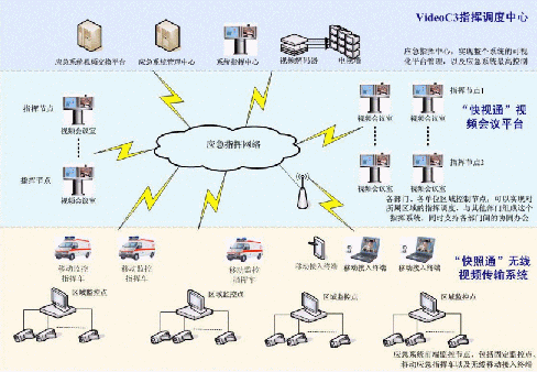 C3I視頻應(yīng)急指揮協(xié)同系統(tǒng)在政府IP網(wǎng)絡(luò)中處于城市的神經(jīng)中樞。它將政府各個(gè)部門、單位聯(lián)系成為一個(gè)整體。在C3I視頻應(yīng)急指揮協(xié)同系統(tǒng)的前端,由"快照通"無線視頻傳輸系統(tǒng)對(duì)政府所屬各個(gè)單位進(jìn)行實(shí)時(shí)監(jiān)控,時(shí)刻掌握現(xiàn)場(chǎng)動(dòng)態(tài),該部分支持固定點(diǎn)監(jiān)控,也支持移動(dòng)指揮點(diǎn)和無線移動(dòng)接入終端,保證了前方工作的靈活、機(jī)動(dòng)性;在系統(tǒng)的指揮中心部分,由VideoC3指揮調(diào)度中心來支持,它一方面需要對(duì)前端的監(jiān)控信息進(jìn)行控制,同時(shí),要對(duì)整個(gè)政府進(jìn)行綜合管理調(diào)度,在發(fā)生突發(fā)狀態(tài)的時(shí)刻,現(xiàn)場(chǎng)前端"快照通"捕獲的相應(yīng)信息通過C3I系統(tǒng)平臺(tái),迅速傳遞至指揮中心部分,政府管理人員通過VideoC3指揮調(diào)度中心對(duì)前端進(jìn)行遠(yuǎn)程指揮,在第一時(shí)間緊急處理現(xiàn)場(chǎng)突發(fā)事件;在整個(gè)C3I系統(tǒng)中,政府各個(gè)部門、單位之間通過"快視通"視頻會(huì)議平臺(tái)進(jìn)行辦公交流,支持各部門間的協(xié)同辦公,同時(shí),也可以通過其實(shí)現(xiàn)對(duì)所屬區(qū)域的指揮調(diào)度。