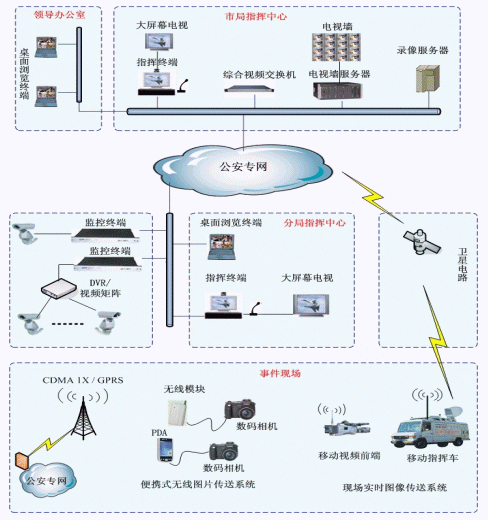 系統(tǒng)分3個層次,市局指揮中心、區(qū)縣分局(交警、消防)指揮中心、移動指揮終端(現(xiàn)場指揮中心),主要設備包括:綜合視頻交換機、指揮終端、監(jiān)控終端、電視墻服務器、存儲錄像服務器、瀏覽終端、移動視頻前端、搞清晰圖片傳輸系統(tǒng)等。系統(tǒng)結構如圖示。