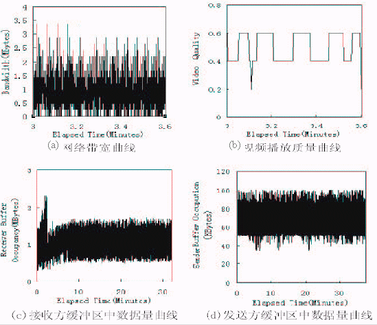 圖3給出了在劇烈的帶寬變化情況下,應(yīng)用該技術(shù)的視頻點播系統(tǒng)所達到的性能。在圖3中,(a)表示所使用的帶寬情況;(b)表示客戶端得到的視頻播放質(zhì)量;(c)和(d)分別表示在播放過程中接收緩沖區(qū)和發(fā)送緩沖區(qū)中的數(shù)據(jù)量情況。對比圖3(a)(b)可以看出,在網(wǎng)絡(luò)帶寬劇烈變化的情況下,視頻播放質(zhì)量的變化很平緩。由圖3(c)知,接收方緩沖區(qū)沒有發(fā)生上溢或下溢,這表明客戶始終能享受到連續(xù)的視頻播放,沒有出現(xiàn)播放卡殼;也沒有出現(xiàn)因為緩沖區(qū)上溢而丟失從網(wǎng)絡(luò)傳過來的數(shù)據(jù)。圖3(d)則表明發(fā)送緩沖區(qū)始終在80k字節(jié)左右,沒有發(fā)生下溢,說明數(shù)據(jù)發(fā)送模塊始終有數(shù)據(jù)可發(fā),即網(wǎng)絡(luò)帶寬得到了充分利用。
