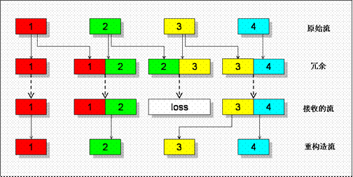 在傳輸帶寬允許的情況下,在發(fā)送端對重要的宏塊進(jìn)行冗余編碼,發(fā)送給對端,這樣的話當(dāng)網(wǎng)絡(luò)出現(xiàn)異常出現(xiàn)丟包時(shí),可以最大限度保護(hù)重要的編碼宏塊不丟失。如下: